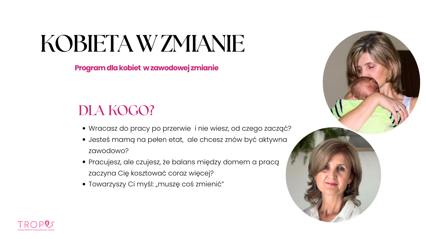 KOBIETA W ZMIANIE 6-tygodniowy program rozwojowy dla kobiet, które chcą odzyskać sprawczość, jasność i odwagę w momencie zawodowej zmiany Czy to o Tobie? Masz wrażenie, że Twoje życie to nieustanne łapanie równowagi. Jesteś jednocześnie w pracy, w domu, w relacjach i obowiązkach — a mimo wysiłku czujesz, że gdzieś po drodze zniknęłaś Ty.…